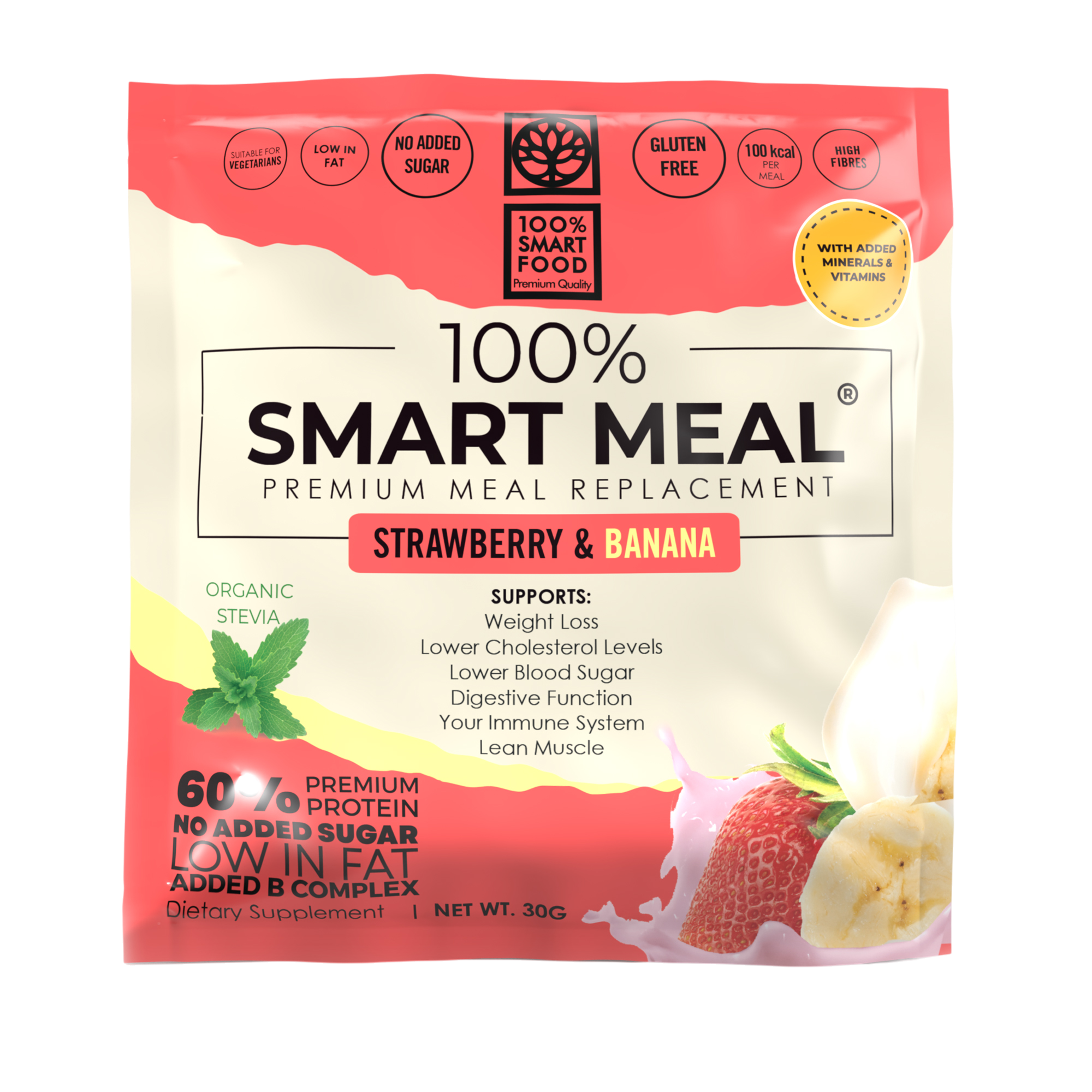 100% Smart Meal je visokoproteinski zamjenski obrok u prahu koji sadrži sve ključne nutrijente potrebne za tijelo – proteine, vlakna, vitamine i minerale – bez dodanog šećera i nepotrebnih masnoća. Idealno rješenje za brzu, zdravu i praktičnu prehranu u pokretu, nakon treninga ili kada nemate vremena za pripremu obroka.